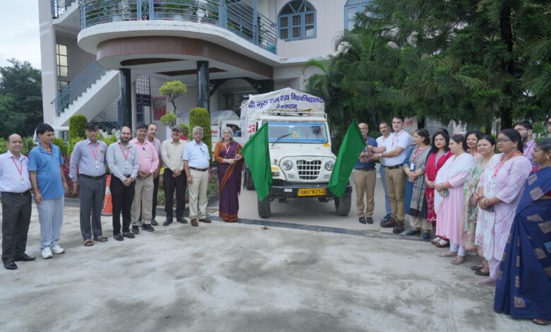 एसजीआरआर विश्वविद्यालय की कुलपति व कुलसचिव ने हरी झण्डी दिखाकर वाहनों को किया रवाना,