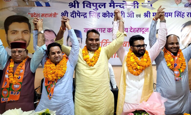 देहरादून।भारतीय जनता पार्टी महानगर देहरादून के अध्यक्ष सिद्धार्थ उमेश अग्रवाल की अध्यक्षता में भारतीय जनता युवा मोर्चा (भाजयुमो) के प्रदेश अध्यक्ष विपुल मैंदोली, प्रदेश महामंत्री मुलायम सिंह रावत और दीप कोश्यारी (दीपेंद्र) का भारतीय जनता पार्टी महानगर कार्यालय में भव्य स्वागत एवं अभिनंदन किया गया। इस अवसर पर पार्टी कार्यकर्ताओं में जोश और उत्साह का वातावरण देखने को मिला।